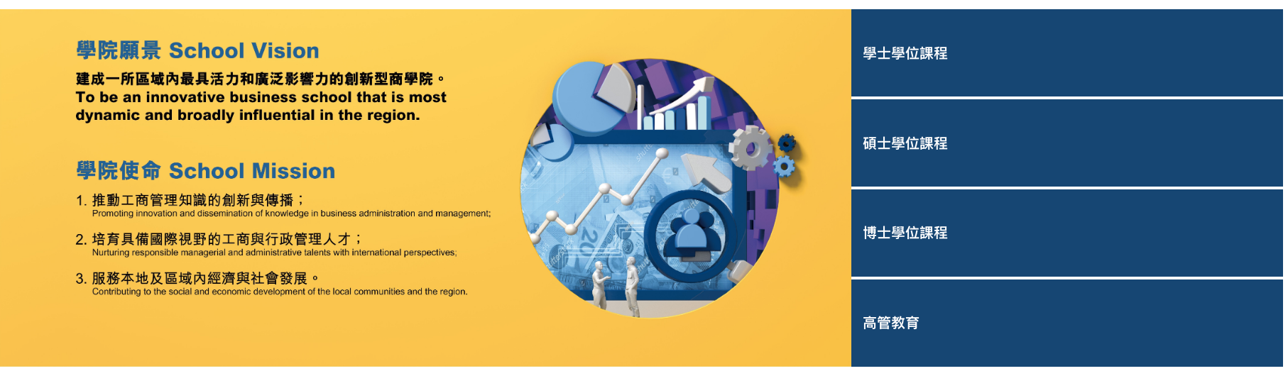澳门科技大学商学院成立于2000年,是大学成立初期的四个学院之一,也是目前规模最大的学院。学院在英国《泰晤士高等教育》机构公布的全球学科2025排名中,在“商业和经济学”学科位列201–250之间。2023年7月,学院获得国际商学院促进协会(AACSB)认证,跻身全球6%顶尖商学院之列。商学院设有会计与财务金融学系、管理学系和决策科学系。目前开设两个学士学位课程,包括工商管理学士和应用经济学学士;十一个硕士学位课程,涵盖高级管理人员工商管理、工商管理、公共行政管理、管理、会计、金融、金融科技、应用经济学、商业分析学、公益与社会组织管理和供应链管理;以及两个博士学位课程,包括管理学博士和工商管理博士。